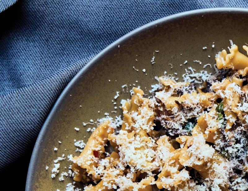 Chanterelles from the woods at Big Table Farm winery in Oregon’s Willamette Valley accent vibrant, knee-high chard from owners Clare Carver and Brian Marcy’s garden.