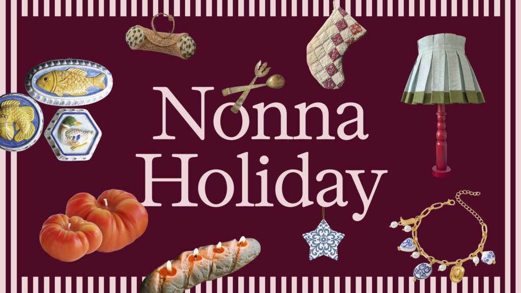 Nonna Holiday is all about things you’d find at your grandmother’s house: family recipes, coziness, and vintage kitchen items. It’s as if you turned a warm hug and home-cooked meal into an aesthetic. Think homemade pasta and bread, tomato motifs, quilted details, vintage silverware, and keepsake items with a nostalgic, personalized touch (whether that be an engraving, embroidery, or a handwritten recipe). The trend edit spotlights GiftShopByKORISSA’s custom bread baskets, perfectly fitting for the Nonna Holiday emphasis on warmth and tradition.
