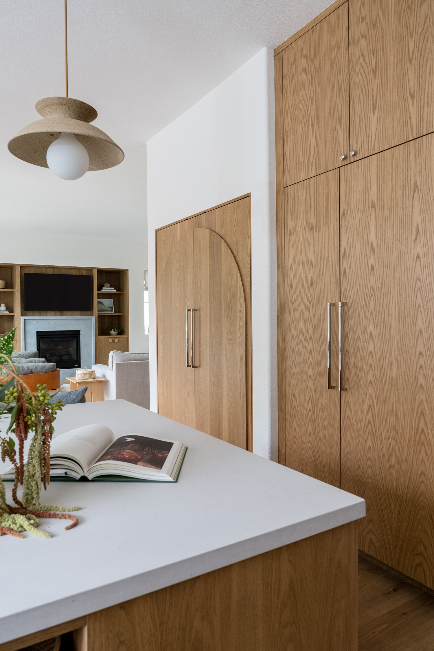 “The old kitchen had granite countertops and worn wood cabinets, it somehow felt dark in what is a really spacious and open room,” Katie says. “They wanted the kitchen to be open and inviting, wanted a larger island for guests and family to gather around while meals are prepared. The clients also requested a reeded wood detail somewhere, and arches if they worked which we had a fun way of incorporating through the pantry doors.”