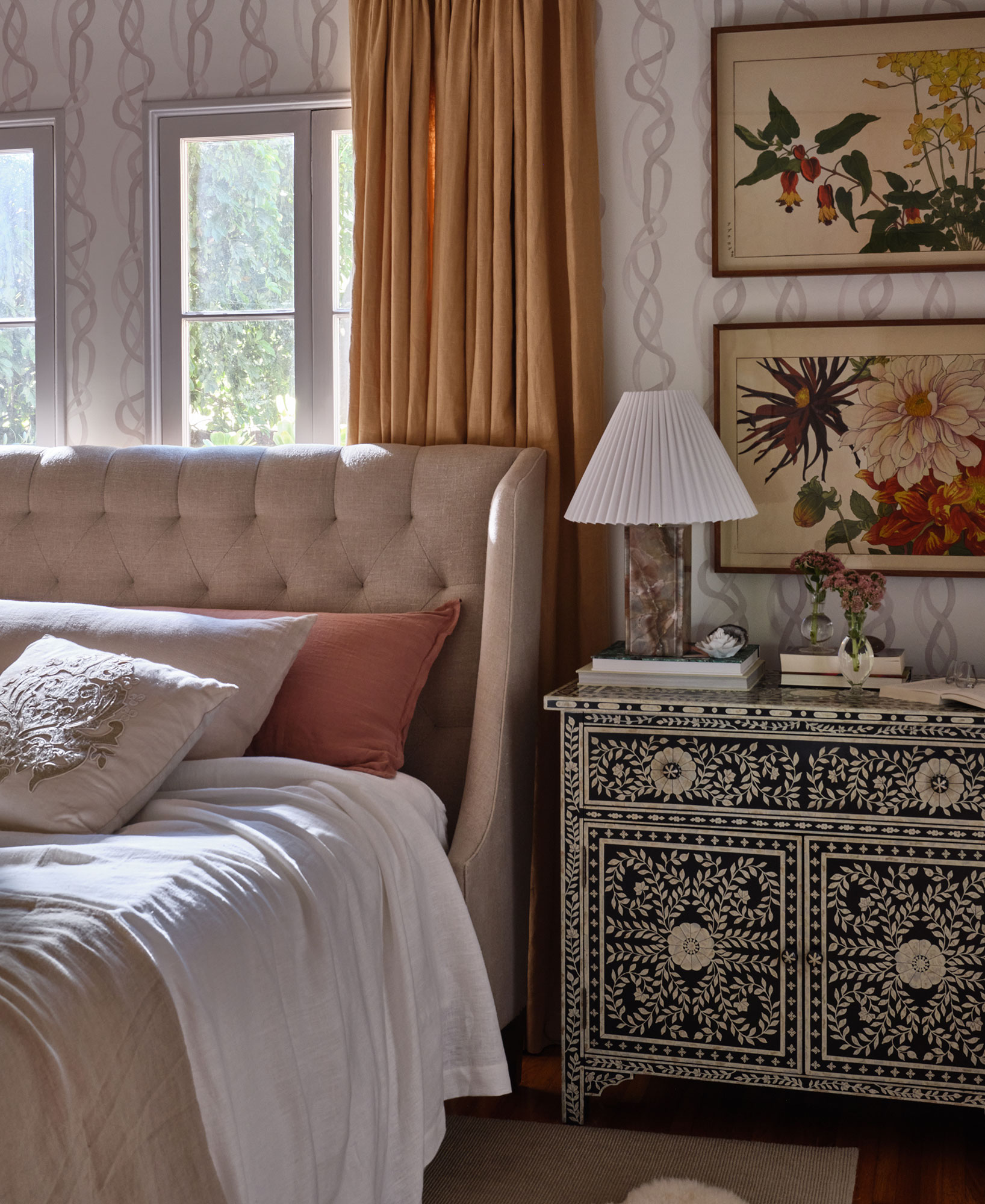 Jennifer made the primary bedroom a tranquil sanctuary, anchored by her own wallpaper, Miller House’s “Vines” wallpaper in the “Salt” colorway. “Layers of intrigue were added with hand-painted Japanese garden flowers and inlaid Indian chests repurposed as nightstands,” she adds. “The resulting layered aesthetic, though intricate, evokes a remarkable sense of calm.”