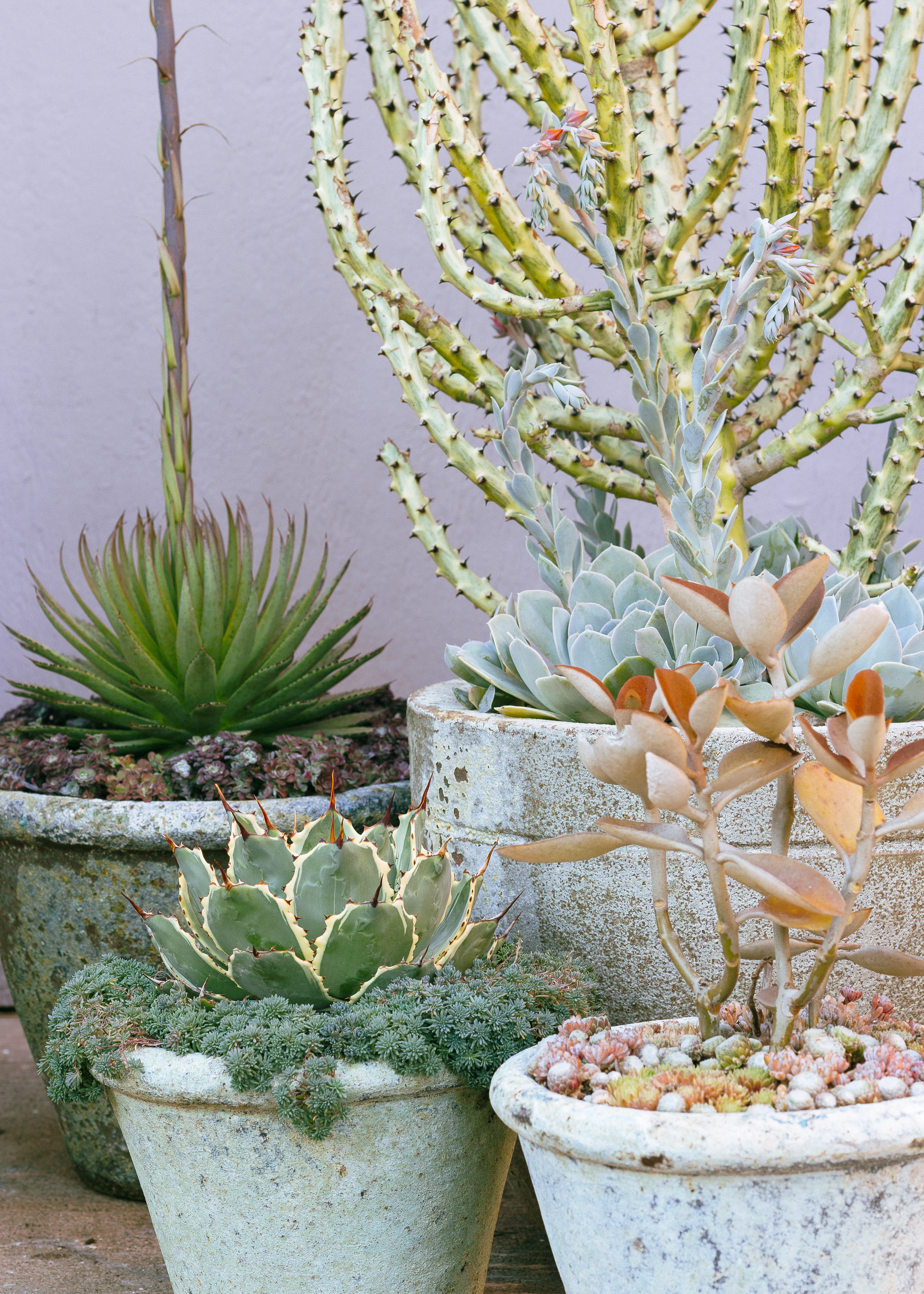 - Desert Southwest: Rosemary topiaries, agave, desert willow, drought-tolerant succulents