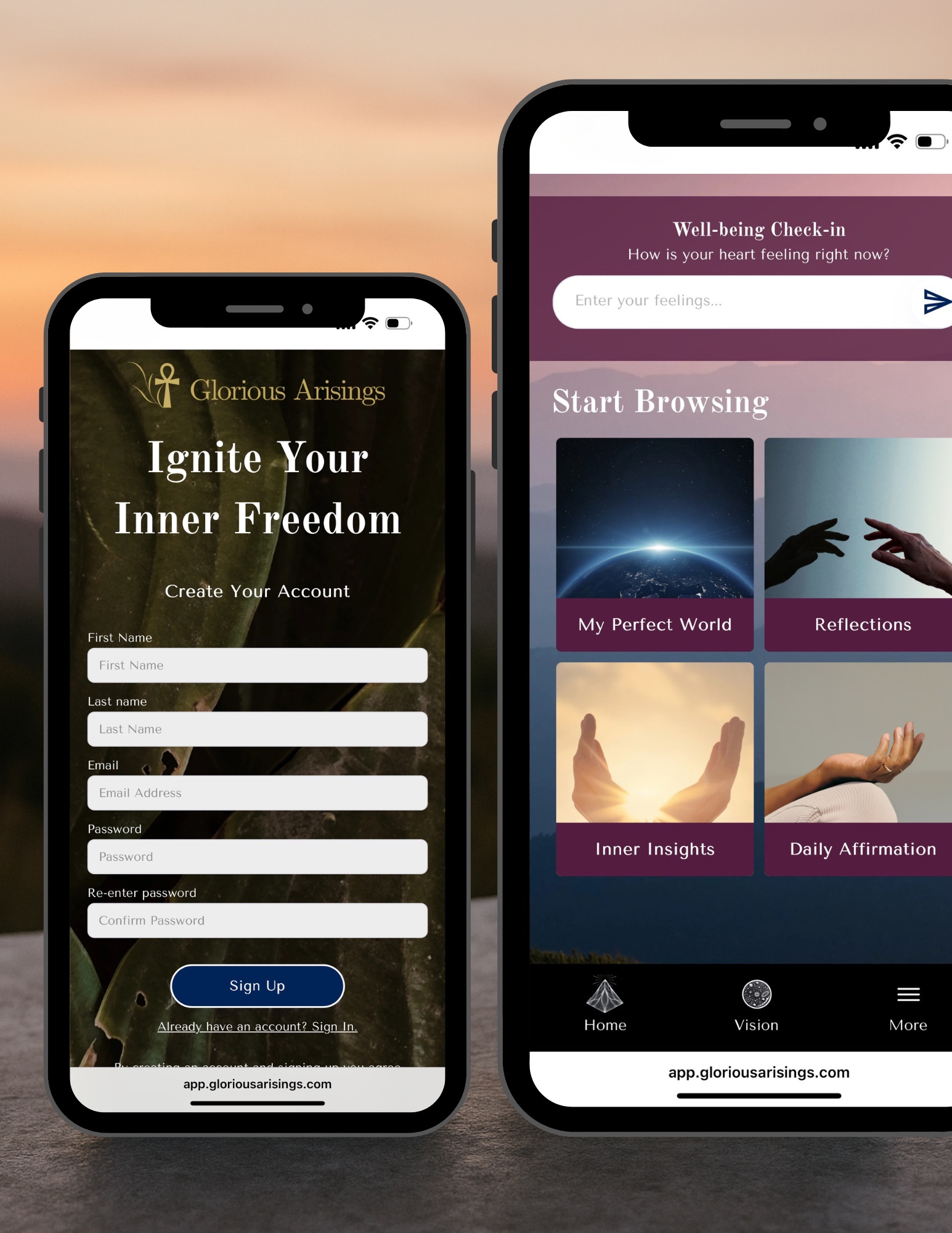 Glorious Arisings is a first-of-its-kind spiritual wellness platform designed to support emotional healing, self-reflection, and soul-centered growth through conscious technology. More than a well-being app, it’s a daily ritual space—offering guided reflections, intuitive check-ins, intention-setting tools, astrology, Human Design insights, and curated soundscapes to help users reconnect with themselves.
