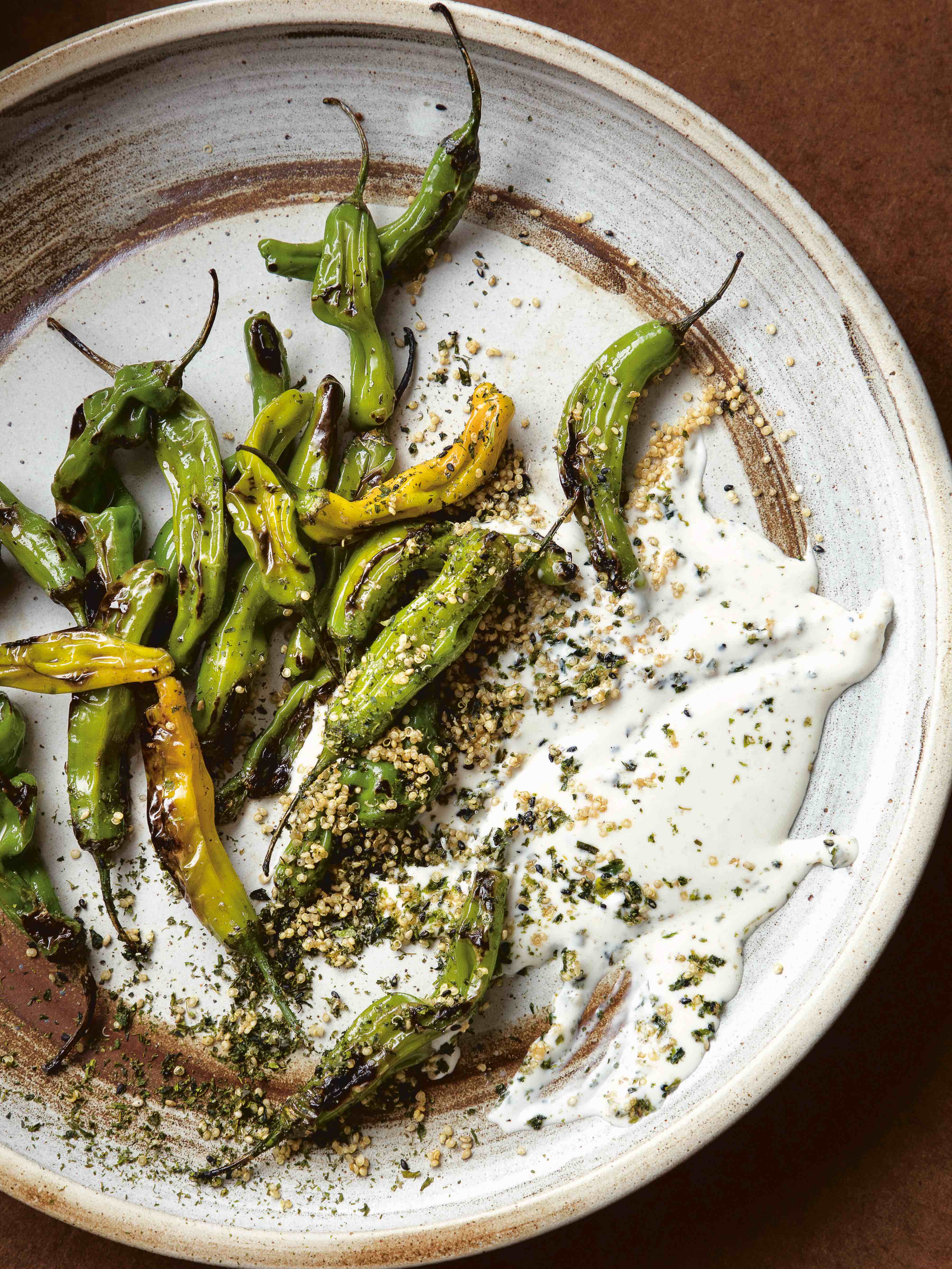 Blistered Shishitos with Furikake Ranch and Crispy Quinoa