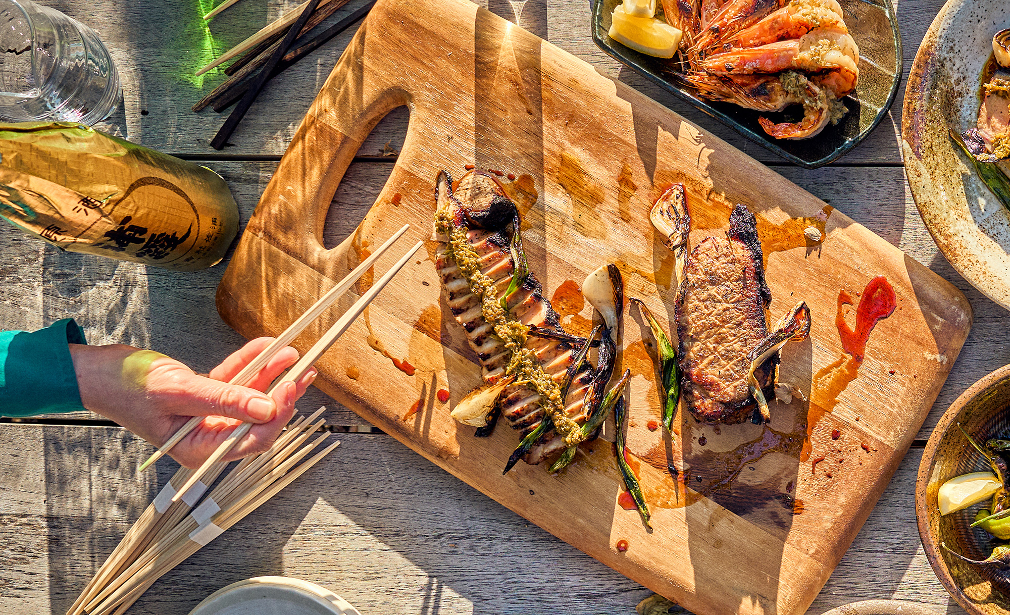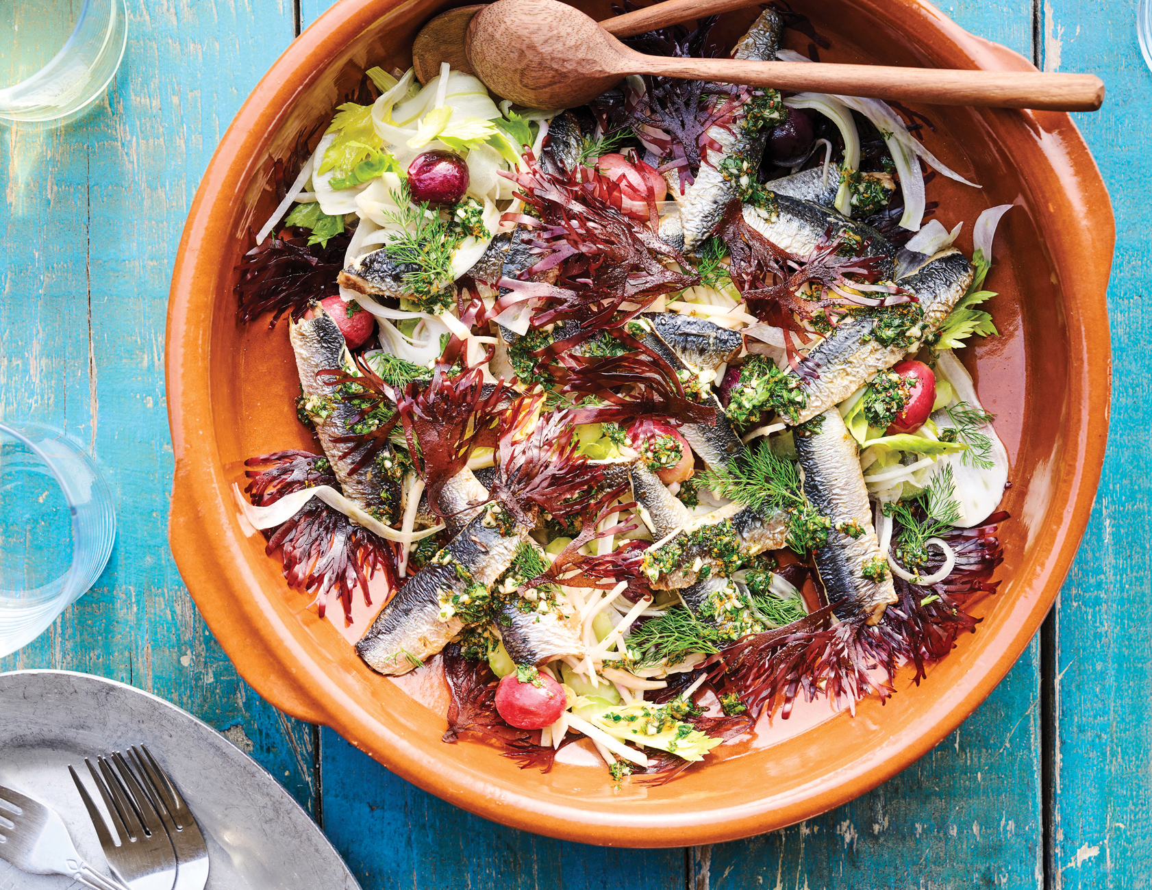 Grilled Sardines with Roasted Grape, Fennel, Seaweed, Celery Root Salad, Seville Orange Vinaigrette & Fennel Pollen Gremolata