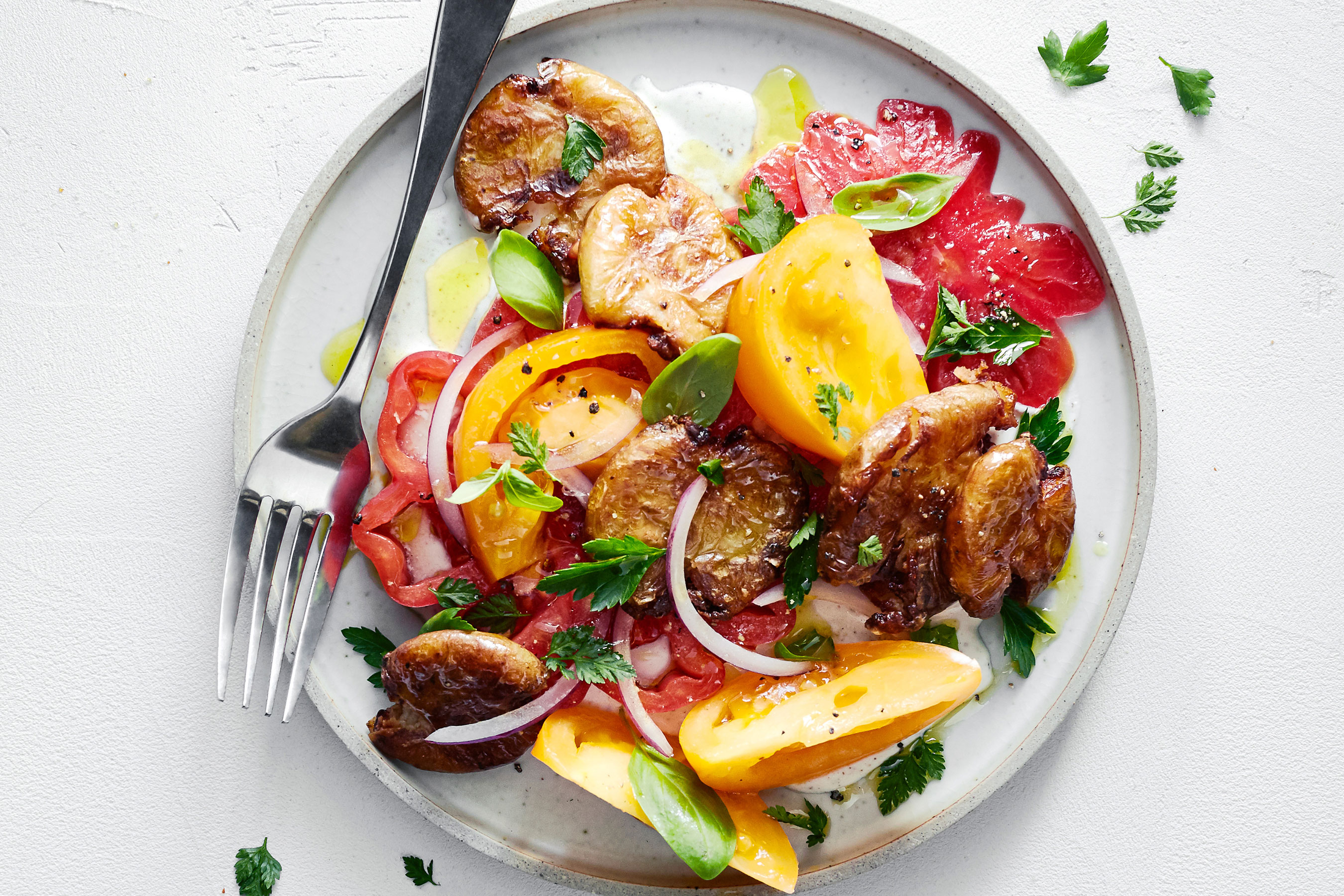 Tomato Salad with Crispy Potatoes and Creamy Feta
