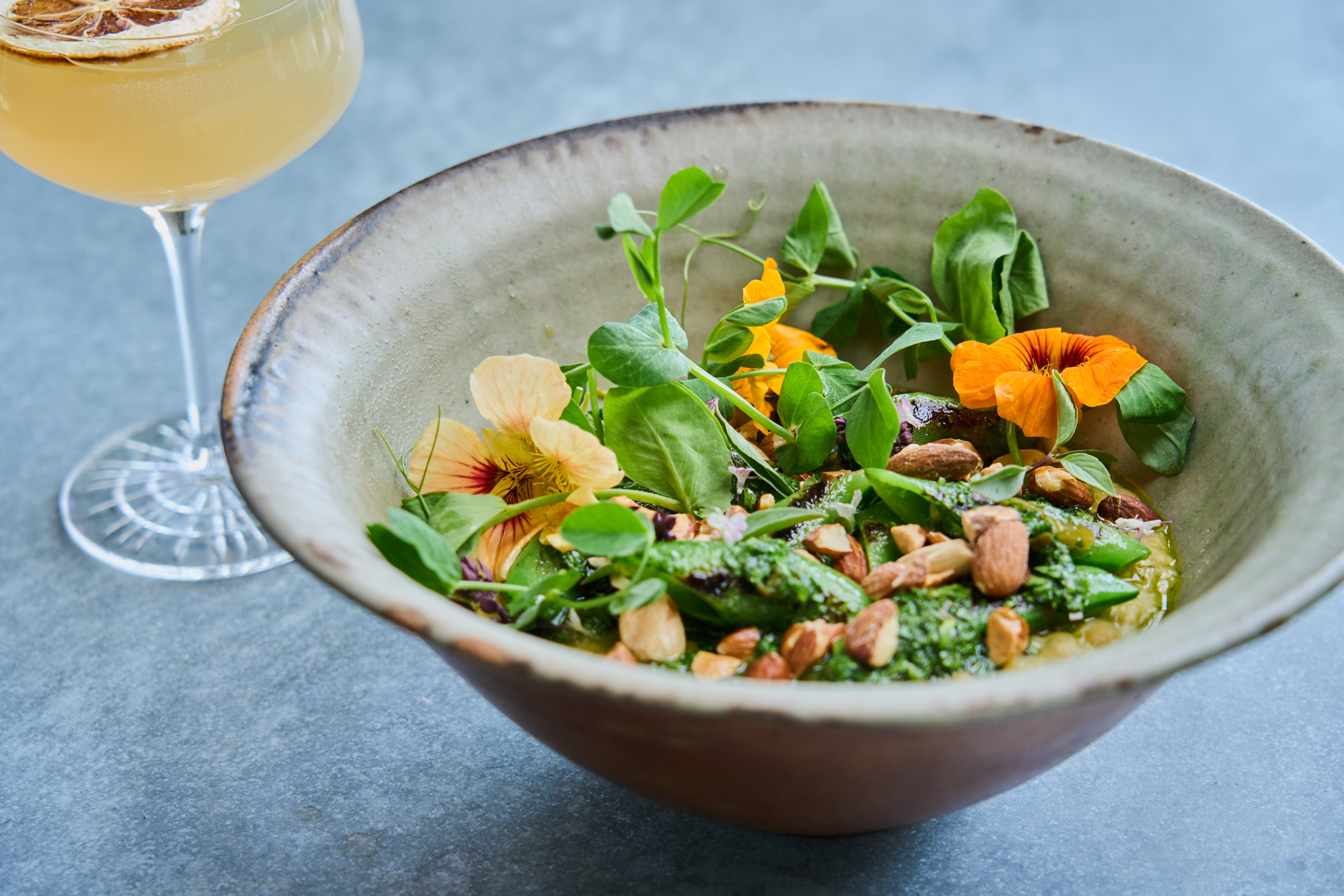 Split Pea Porridge with Almonds, Sugar Snap Peas, and Lemon Basil