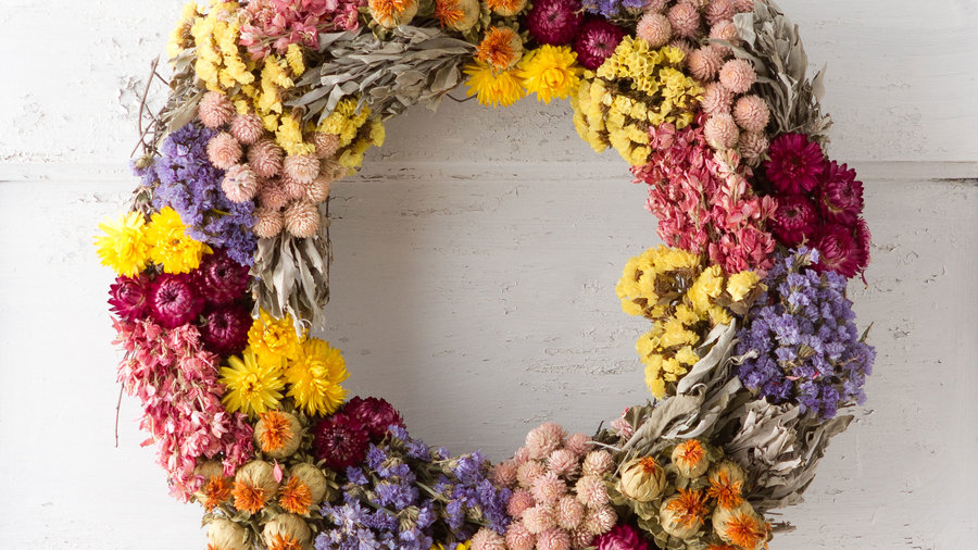 Preserve the bright colors and sweet smells of spring long after the last blossoms have bloomed. The patchwork wreath, a tasteful arrangement of statice, gomphrena, sage, strawflower, and safflower, will brighten any doorway or mantle in your home.