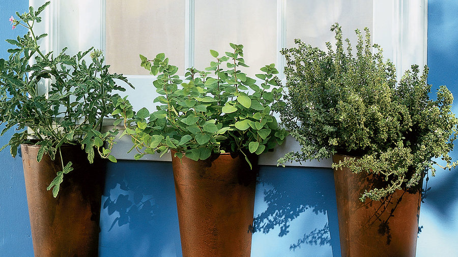 These simple flat-backed rusted steel buckets, each about 6 inches wide and 1 foot deep, offer a new twist on herb gardening. When lined up along a kitchen sill, clipping fresh herbs for cooking is as easy as opening the window. From left to right are ‘Rober’s Lemon Rose’ scented geranium, Greek oregano, and variegated lemon thyme.