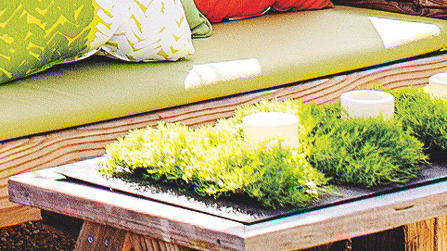 Bands of Irish moss, cut from nursery flats and set into a waterproof metal tray, along with LED candle lights add greenery and glow to a recycled wood table for an evening party. For a more permanent display, fill the tray with crushed taffy gravel.