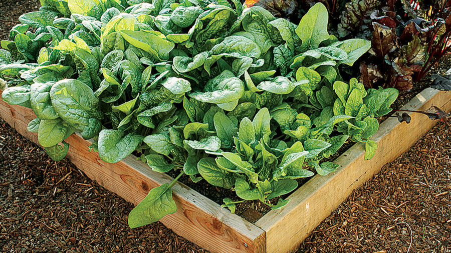 Spinach (three to four sixpacks) and ‘Bull’s Blood’ beet greens (three sixpacks) fill this little 4-by-4-foot, built like a picture frame and set onto the soil.