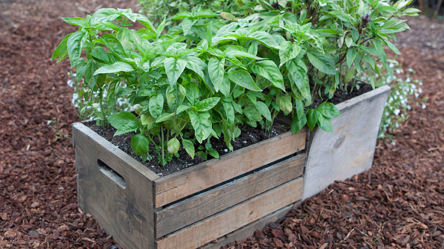 We gave this old wooden box new life as a planter. Filled with a fast-draining soil mix, it’s the perfect vessel for growing a lusty crop of basil in a small space.