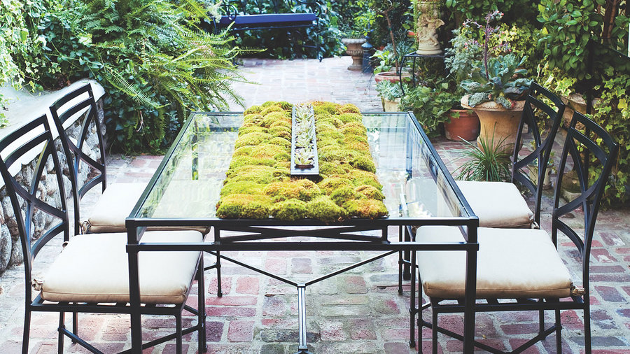 It looks like a planter. But this centerpiece, created by Pasadena landscape architect Heather Lenkin (lenkindesign.com) is lightweight—perfect for a glass tabletop. Just soak floral moss in water to make it easy to work with, tear off chunks, squeeze out excess water, then place moss atop a table. (Use a cookie sheet on a water-vulnerable surface like wood.) On the moss, center a votive tray with a Graptopetalum succulent in each candle slot—no need for soil. Mist to keep the arrangement fresh.