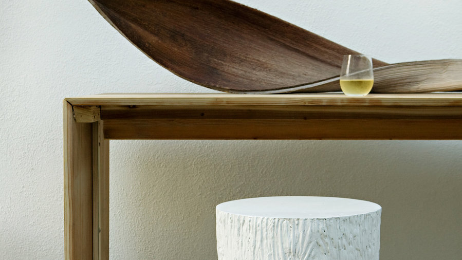 Natural elements shine in the garden’s furniture and décor. The palm sheaf on the table is real (blown down in a storm); the “log” stool is resin.