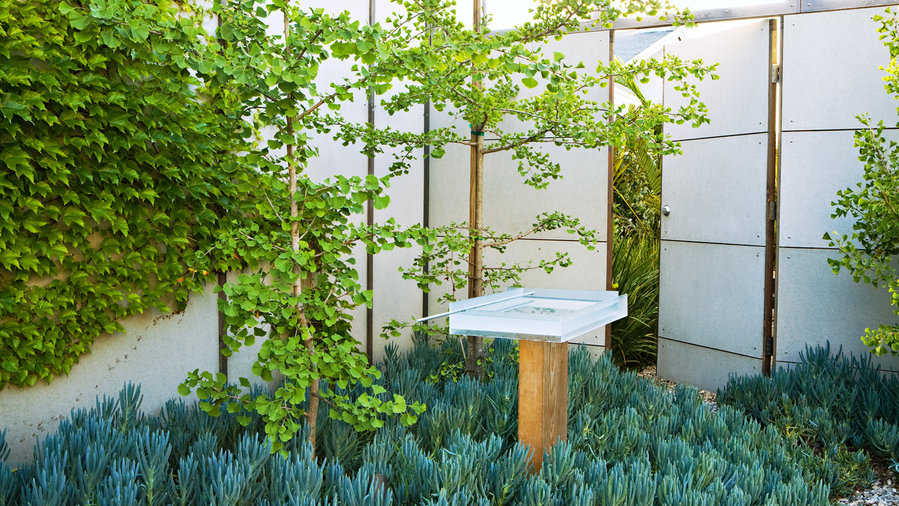 If you have a great natural view, by all means borrow it as the Japanese do. But this garden doesn’t happen to have one, so André turned to the nearby (but unseen) Venice beach for inspiration. He planted in waves and painted the walls the gray of coastal fog.