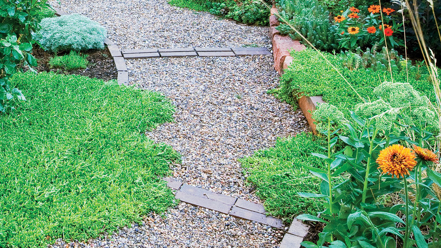 A meandering path encircles a central planting island. Crunchy pea gravel gives the path texture, and Boral bricks in Savannah Brown are designed to slow the journey.