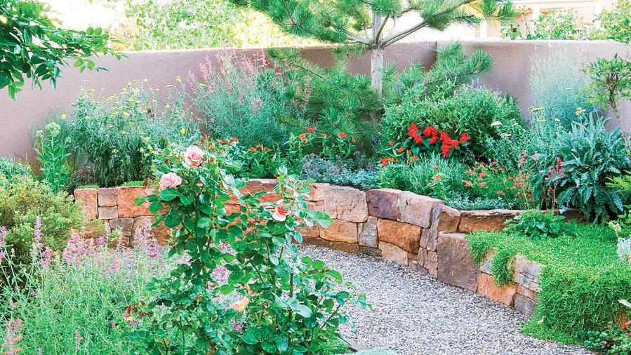 Faced with moss rock, a raised bed hugs the far end of Aria Ponciroli’s backyard. The bed steps down gradually, allowing the tallest section of wall to be an inviting focal point.