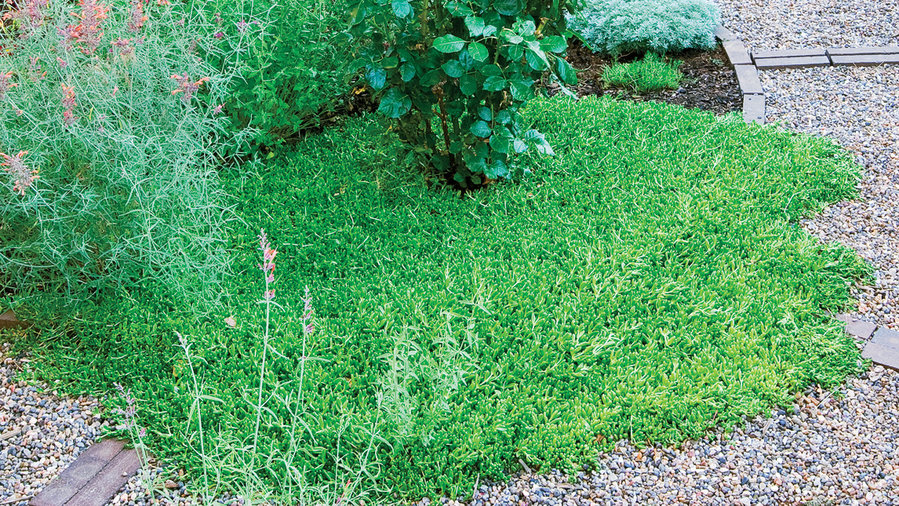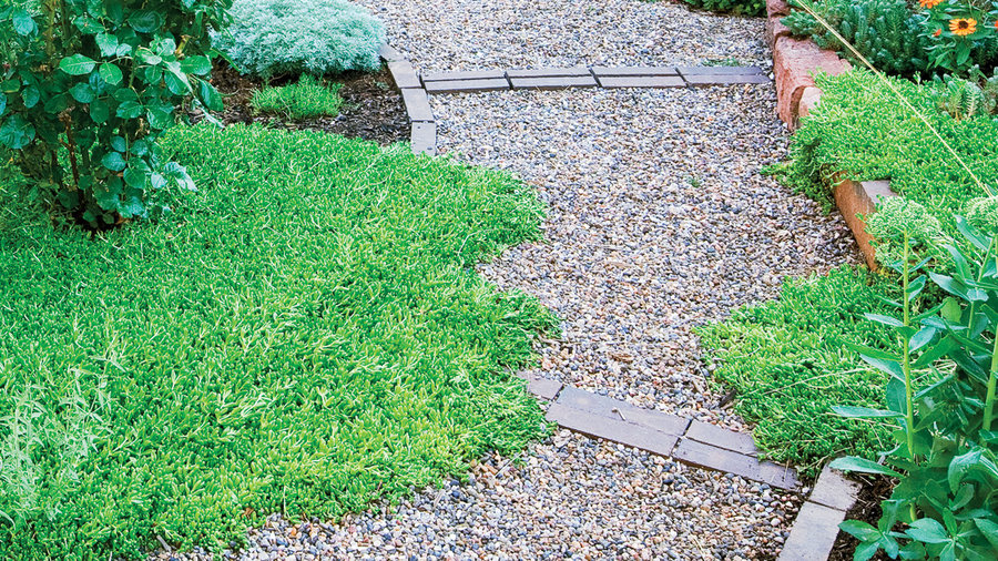 Thick carpets of ice plant (Delosperma congestum) spill out of beds here and there, adding a little gentle messiness to an otherwise orderly garden.