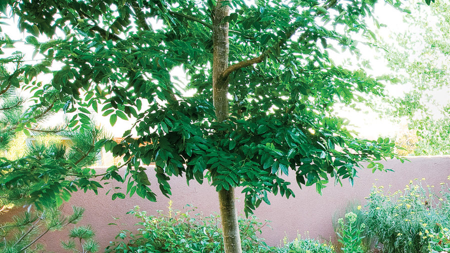 A Japanese pagoda tree (Sophora japonica) is perfect for shading a small garden, thanks to its pleasing structure, moderate size, and willingness to coexist with understory plants.