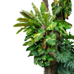 For another way to add vertical interest, philodendrons (Philodendron spp.), Swiss cheese plant (Monstera deliciosa) and other climbing plants can be trained onto a mossy pole or even just mounted to a slab of bark. Many foliage houseplants originate from tropical rainforests where the only way to get light is go up, and aerial roots that can absorb moisture and nutrients help it along the way.