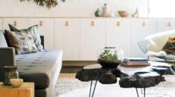 Make any space—even the most modern—feel rustic with decoration from the outdoors. This lush woodland scene includes eucalyptus- and olive-branch garland, birch vases, a string of pine cones, and a wreath of shed dear antlers.
