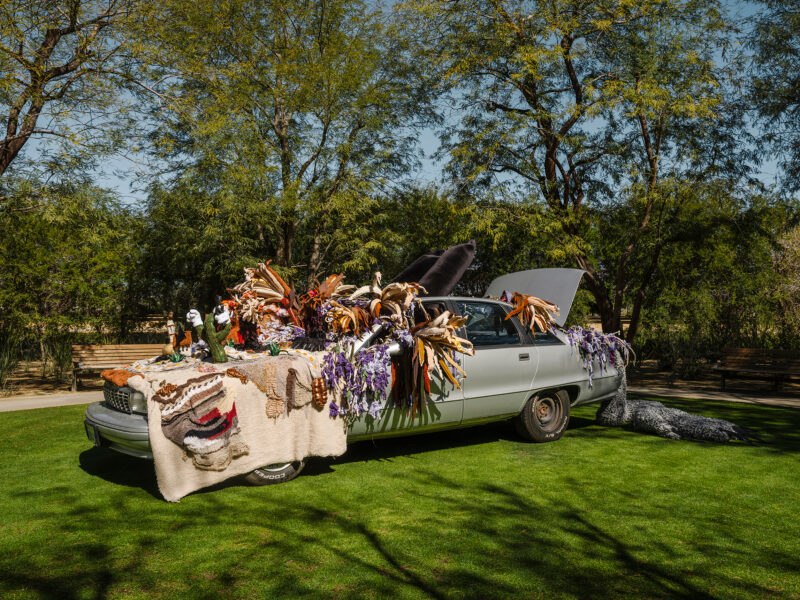 Visitors encounter a dated car that has screeched to a halt in Sunnylands. An absurd array of tangled limbs of two mysterious characters wearing long hats sprawl out of the car and onto the site’s pristine, manicured grounds. Plush, long hands armed with soft-stuffed guns hang from the windows, barely camouflaged by the artificial overgrowth invading the sculpture. These strange characters accompany the visitor on a caricature of a western–meets–sci-fi audio-visual tour of the landscape, like a fictional tour of a seemingly familiar world outside, guided by aliens and ghosts.”