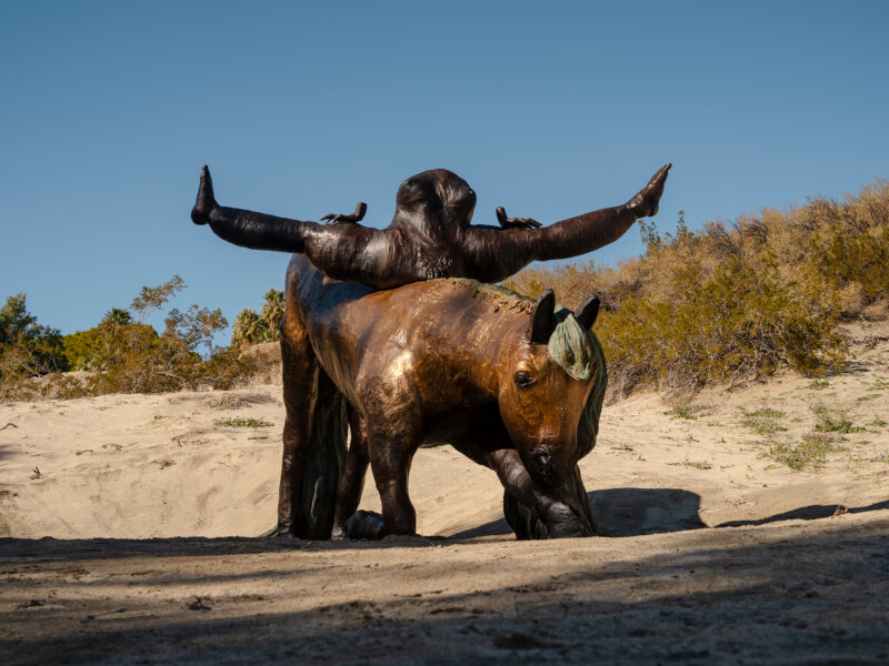 “The desert is a beautiful and attractive—yet also a dangerous and challenging—place. Searching for the Sky (While Maintaining Equilibrium) carries a reflection on ‘cowboy culture’ that exists across both Mexican and American borders, representative of a macho, self-aggrandizing and forceful control of nature. These qualities also relate to the history of art, especially in the American West. In cowboy culture, and also in land art, there is an asserted promise to harness/control nature, which carries a pronounced risk of failure. In bull-riding, whether with a live animal or its mechanical avatar, competition with a wild beast carries an interest in and celebration of failure. The rider will fail and fall. A cowboy will become a clown. In his installation for Desert X, the artist replaced the bull component of the mechanical bull with a flat, geometric, reflective surface, slowing down the machine’s movement to reveal, little by little, what this object really is. Placed in the middle of the desert, in the formation of a herd, the work leads us to contemplate the ‘wild West,’ and our relationship to landscape and our role within it; our condition to be both attracted and replaced by failure.”