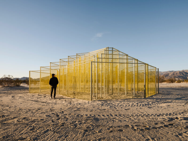 “Responding to the ubiquity of the chain-link fence as a pattern spread across the Coachella Valley—a material that is meant to protect but also carries associations of violence—Rana Begum diffuses the material’s role as a divider through her manipulation of its form and color. We notice how light and air, sand and water, as well as people, can filter through her cloud-like pavilion, which offers paths of expansive escape rather than reductive confinement. Constantly changing with the movement of the sun and the visitors inside of it, the work emphasizes that nothing in life is static; everything, from the world outside to our emotions within, is in a continual state of flux.”